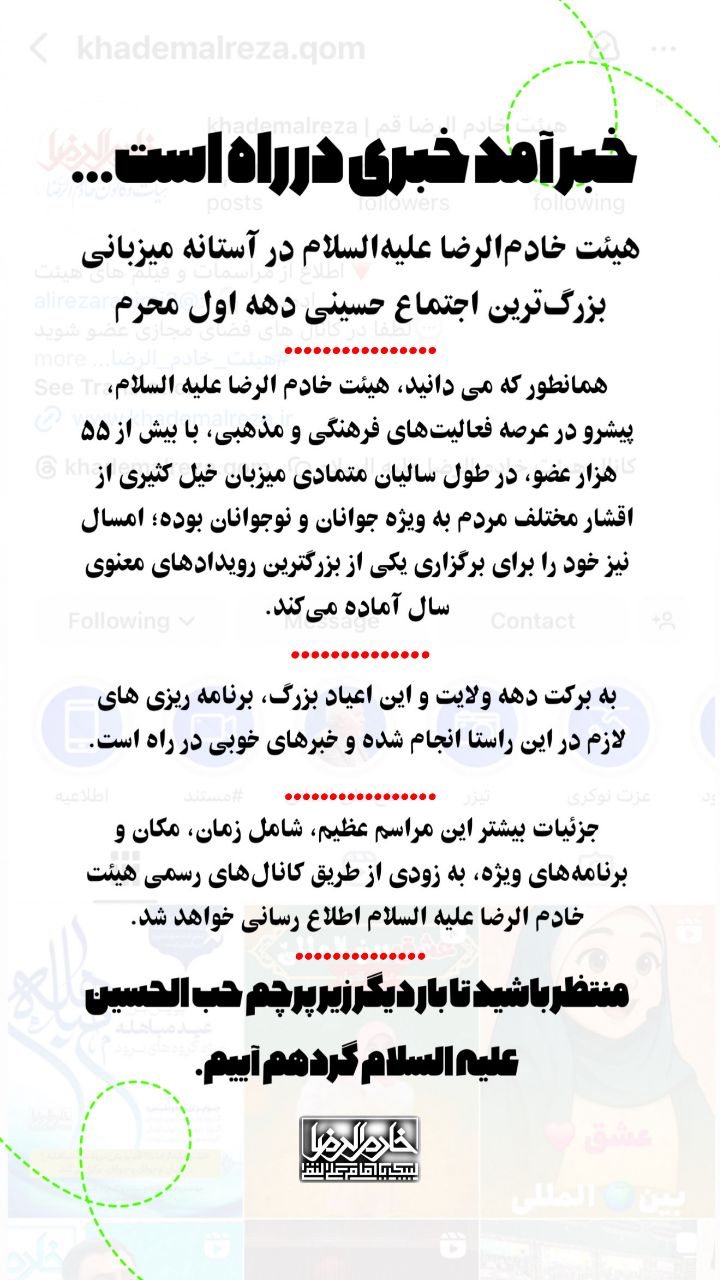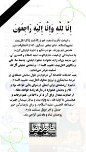 با نهایت تأثر و تأسف خبر درگذشت ذاکر اهل بیت علیهم السلام حاج عباس عسگری که از افتخارات شهر مقدس قم بودند موجب تألم و اندوه فراوان گردید. به نمایندگی از هیئت خادم الرضا علیه السلام و اعضای آن این ضایعه بزرگ را به خانواده محترم ایشان جامعه مداحان و ذاکرین اهل بیت (علیهم السلام و تمامی محبان آل الله تسلیت عرض مینمایم.